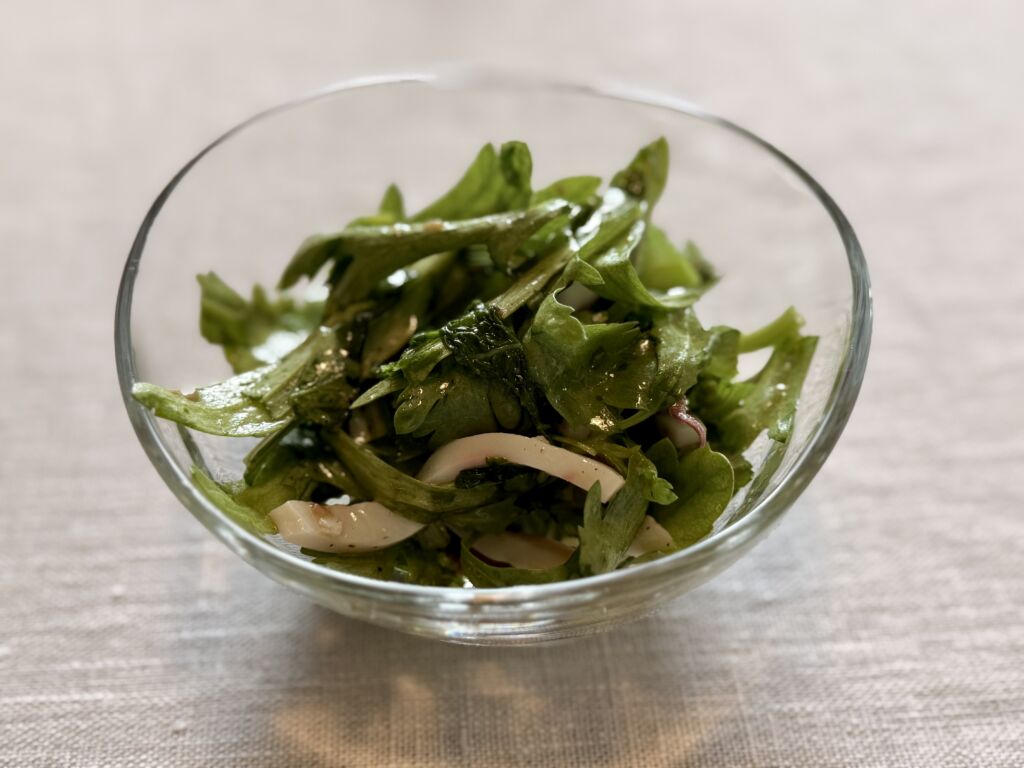 ●春菊とイカのサラダ アンチョビドレッシングで生の春菊をいただきます